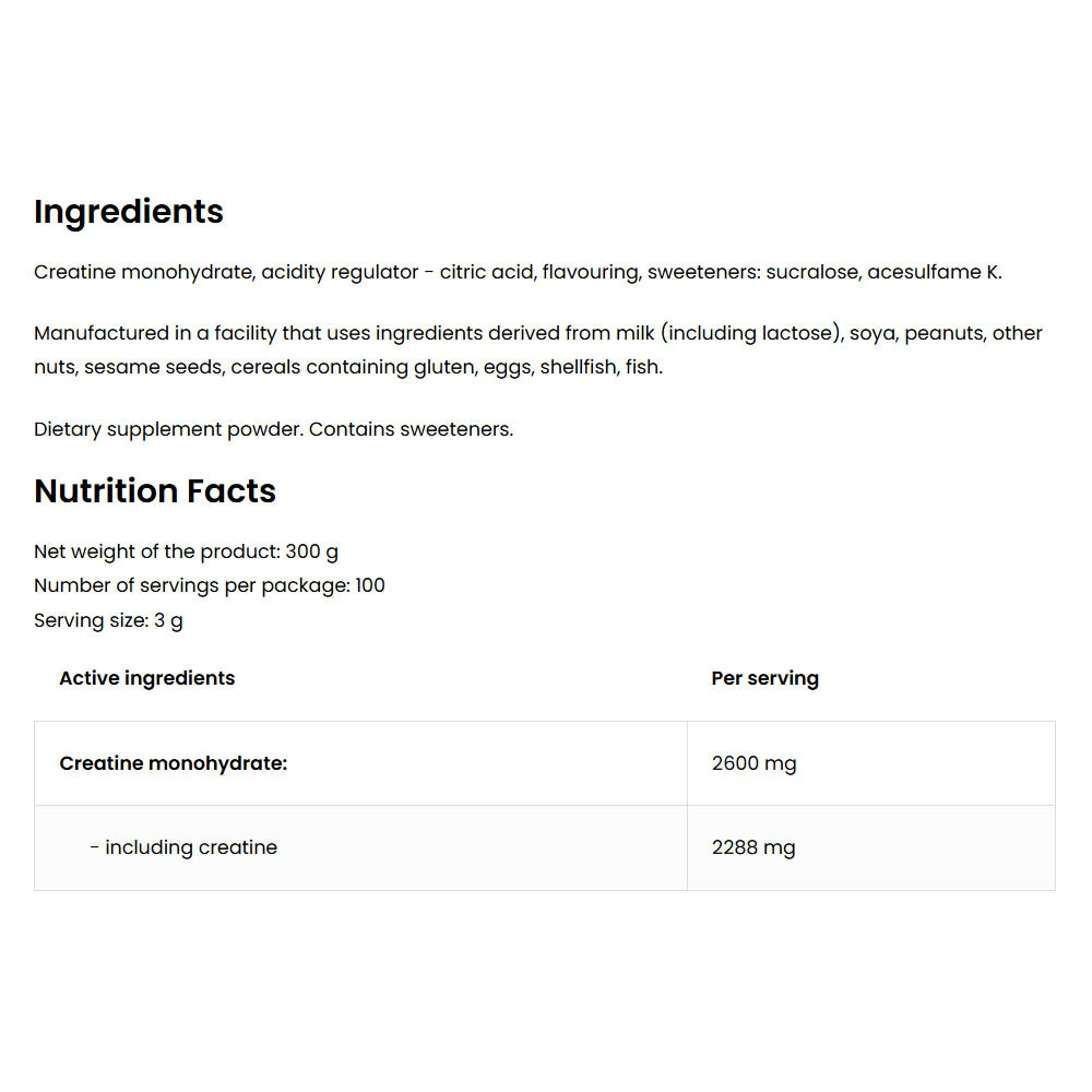 Pakuotėje yra 300 g kreatino monohidrato miltelių, kuriuose taip pat yra rūgštingumą reguliuojančių medžiagų, saldiklių ir kvapiųjų medžiagų.